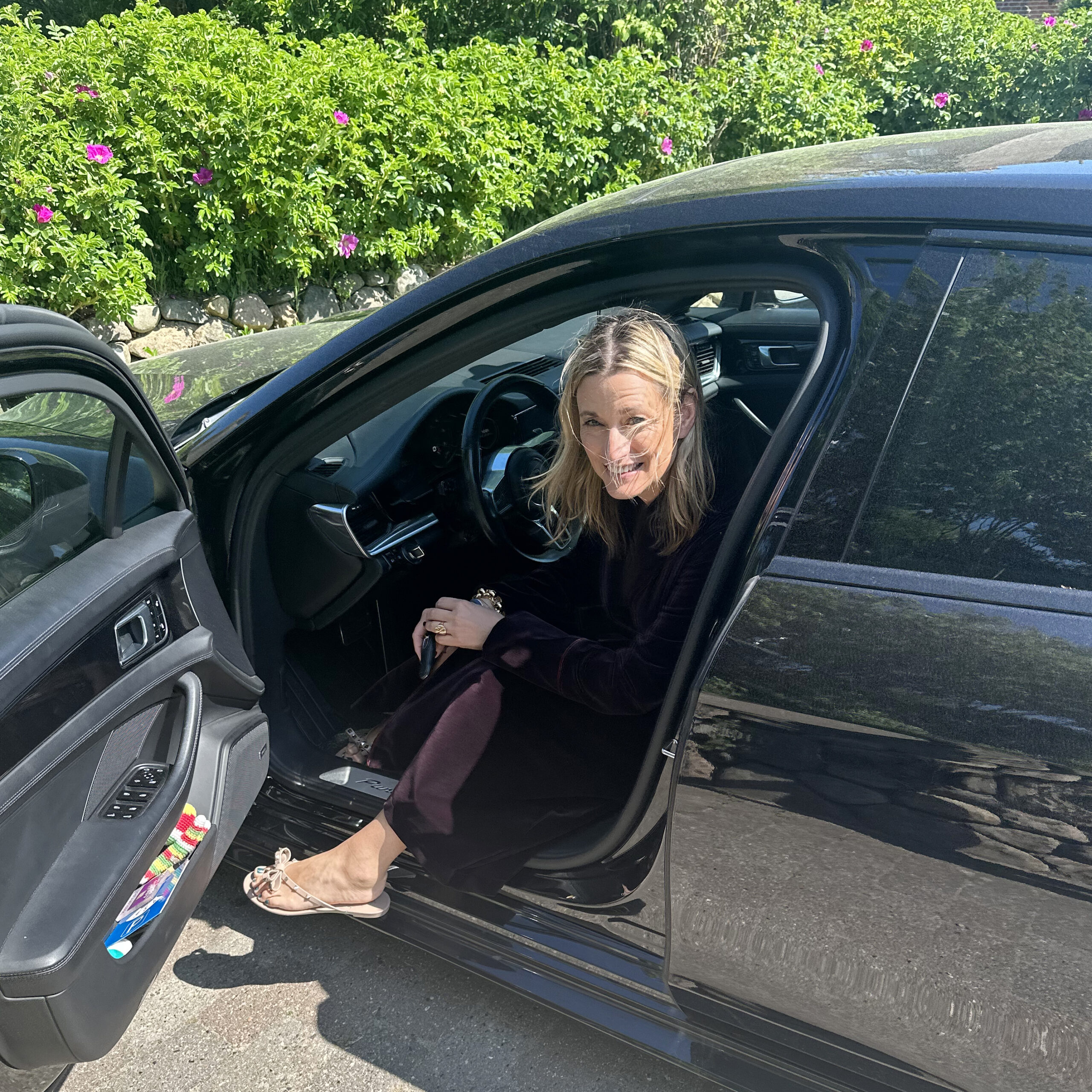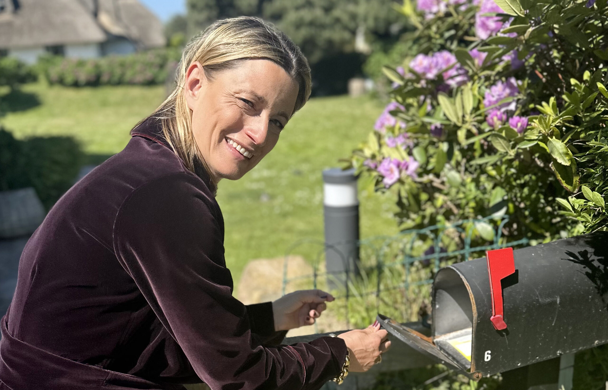 Jenny Zimmerer, gebürtige Reinländerin, war jahrelang im eigenen Famiienunternehmen, in der Schuhindustrie, tätig und zog 2020 nach Sylt. Zu Hause trägt sie gern einen Samt Morgenmantel von MyMorgenrock.
